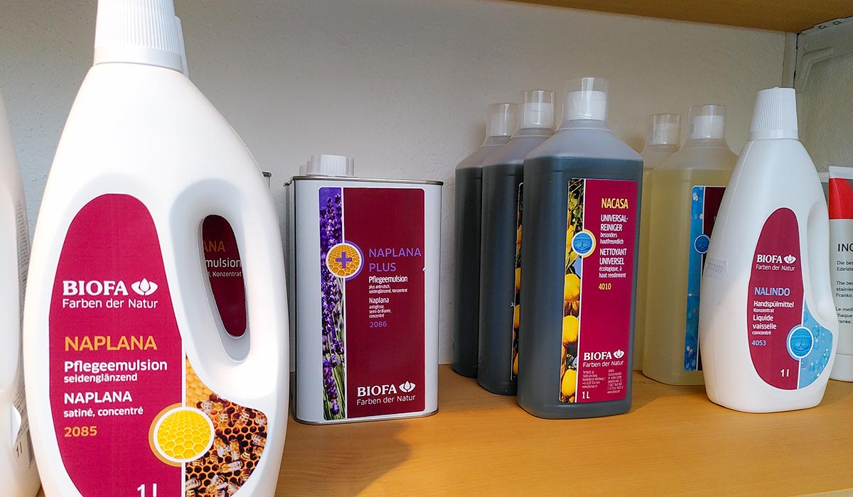 Für Parkett und den täglichen Haushalt bieten wir passende Pflegeemulsionen und schonende Reinigungsmittel an. Sie möchten Ihren Boden oder ein Möbelstück selbst nachölen? Sehr gerne – bei uns finden Sie eine Auswahl an Holzölen, Seifen und Lasuren im Laden, und falls etwas fehlt, bestellen wir es innert weniger Tage. Viele Pflegeprodukte führen wir direkt ab Lager.