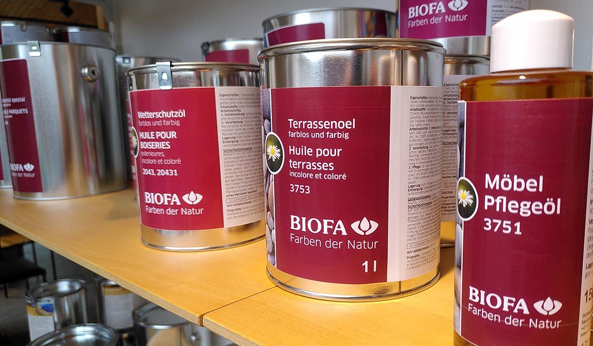 Das gilt ebenso für die Pflege geölter und geseifter Holzoberflächen. Besonders im Aussenbereich – aber auch im Innenraum – ist ein regelmässiges Auffrischen entscheidend, um Küchenfronten, Esstische oder stark beanspruchte Terrassenböden zu schützen und ihre natürliche Schönheit zu bewahren. Dafür setzen wir auf hochwertige, natürliche Öle und Seifen der Marken BIOFA und AGLAIA.