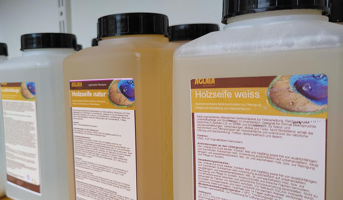 Ähnliches gilt für geseifte Oberflächen: eine sehr traditionelle Behandlungsart, die wieder an Beliebtheit gewinnt. Erzählt Ihre Grossmutter nicht auch, dass Sie früher ihre Holzböden mit Schmierseife gewaschen hat? Je häufiger die Holzseife zur Anwendung kommt, desto resistenter wird die Oberfläche. Einfach ins Wischwasser hinzugefügt, erhält der Holzboden oder die Tischoberfläche mit dem üblichen Reinigungsprozess eine schonende Pflege. Das Holz verändert seine Farbe viel weniger – ja erhält eher einen egalisierenden weisslichen Schimmer.
