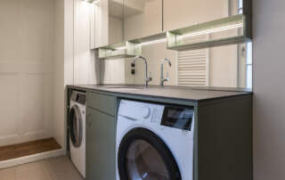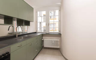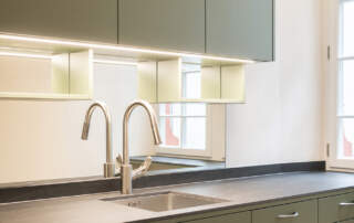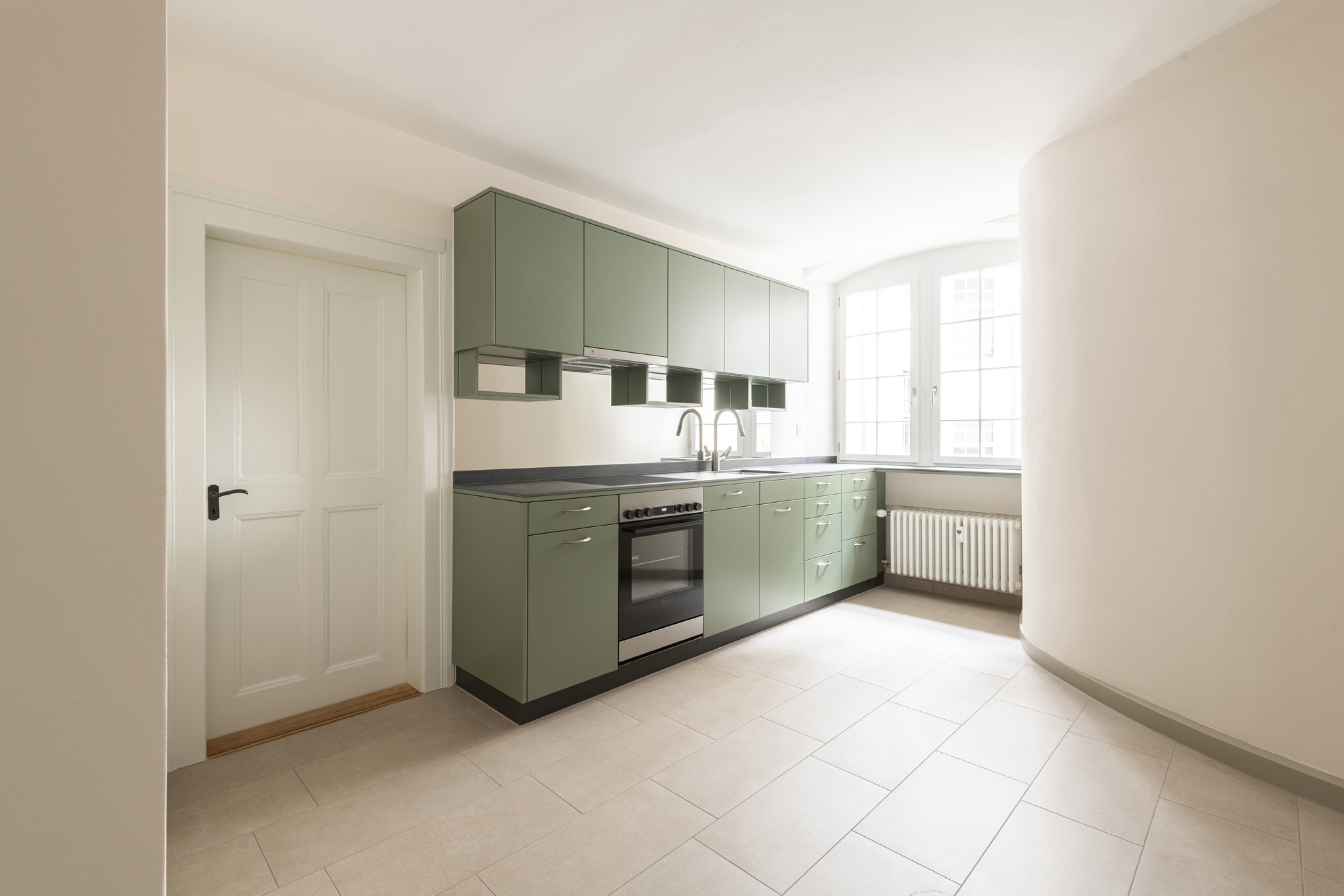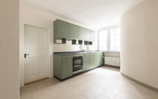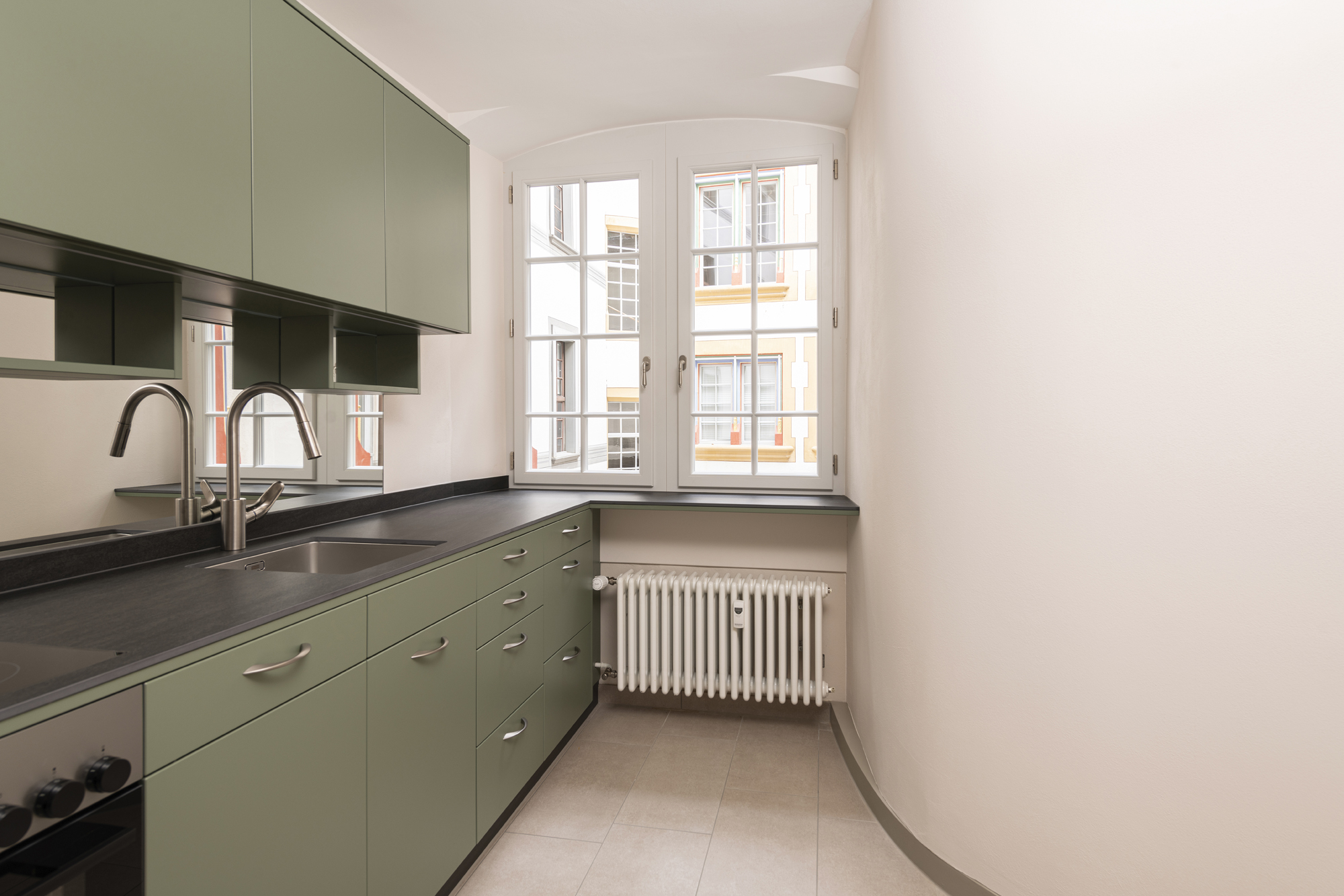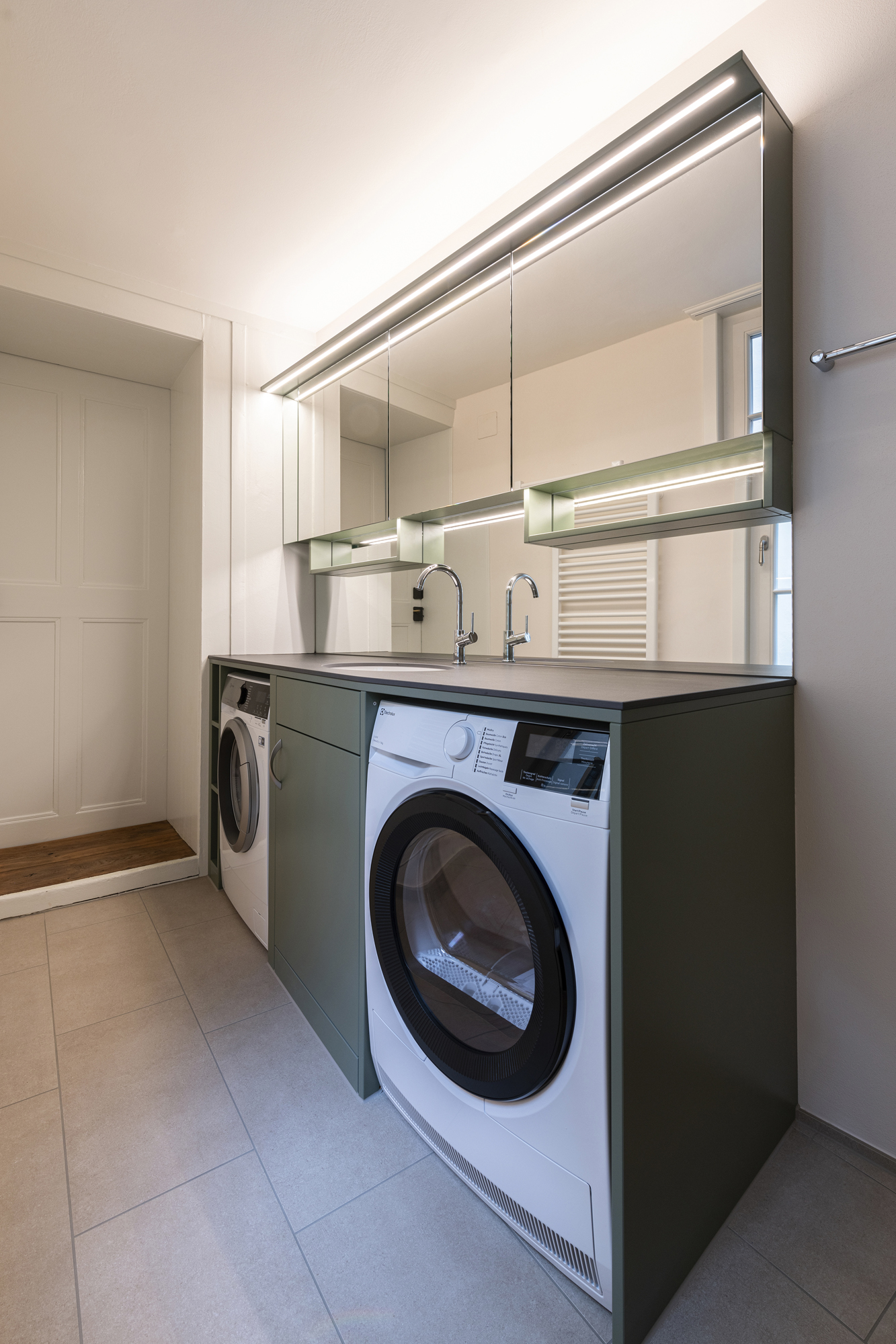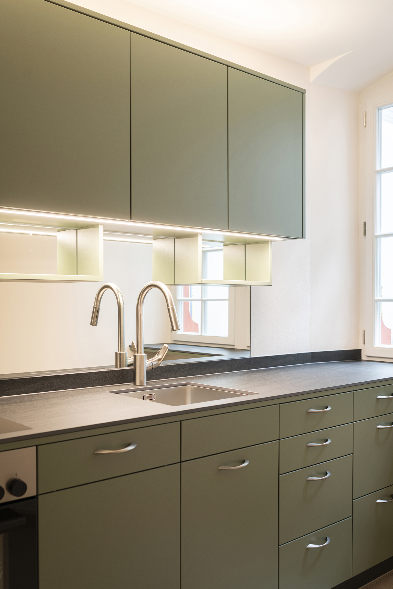 Kompakte Massivholzküche und passendes Badmöbel mit pulverbeschichteten Fronten, massivem Innenleben und einer originellen Spiegelrückwand.
