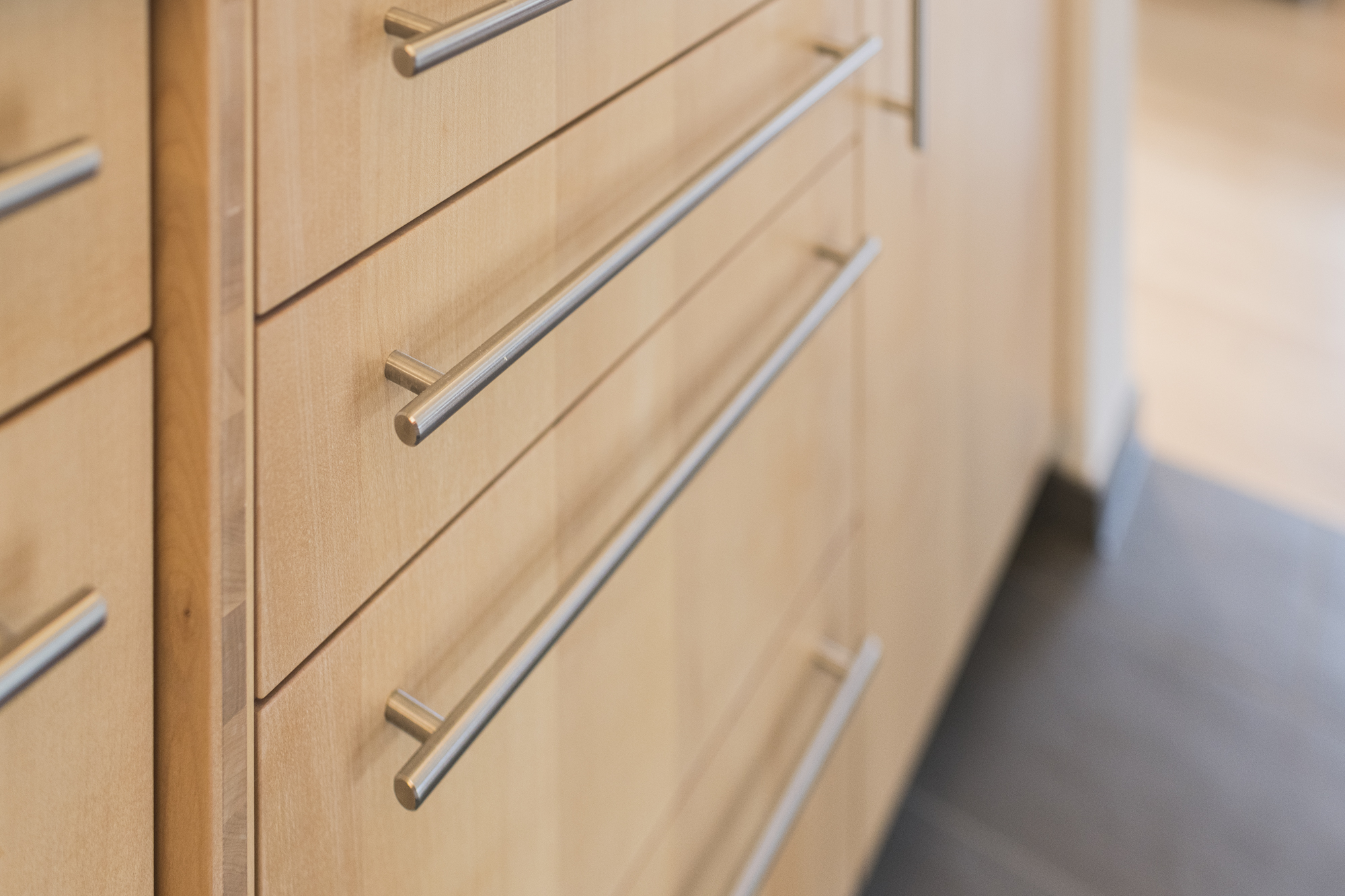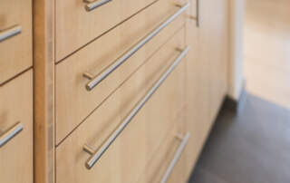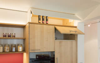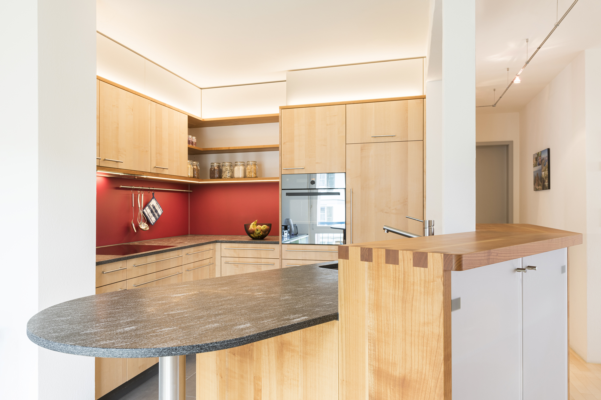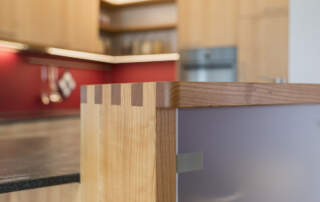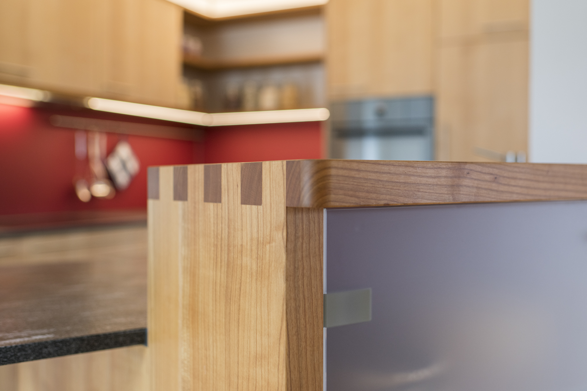 Massivholzküche und edles Barmöbel mit Zinkverbindungen aus Ahorn und massivem Kirschbaumholz.