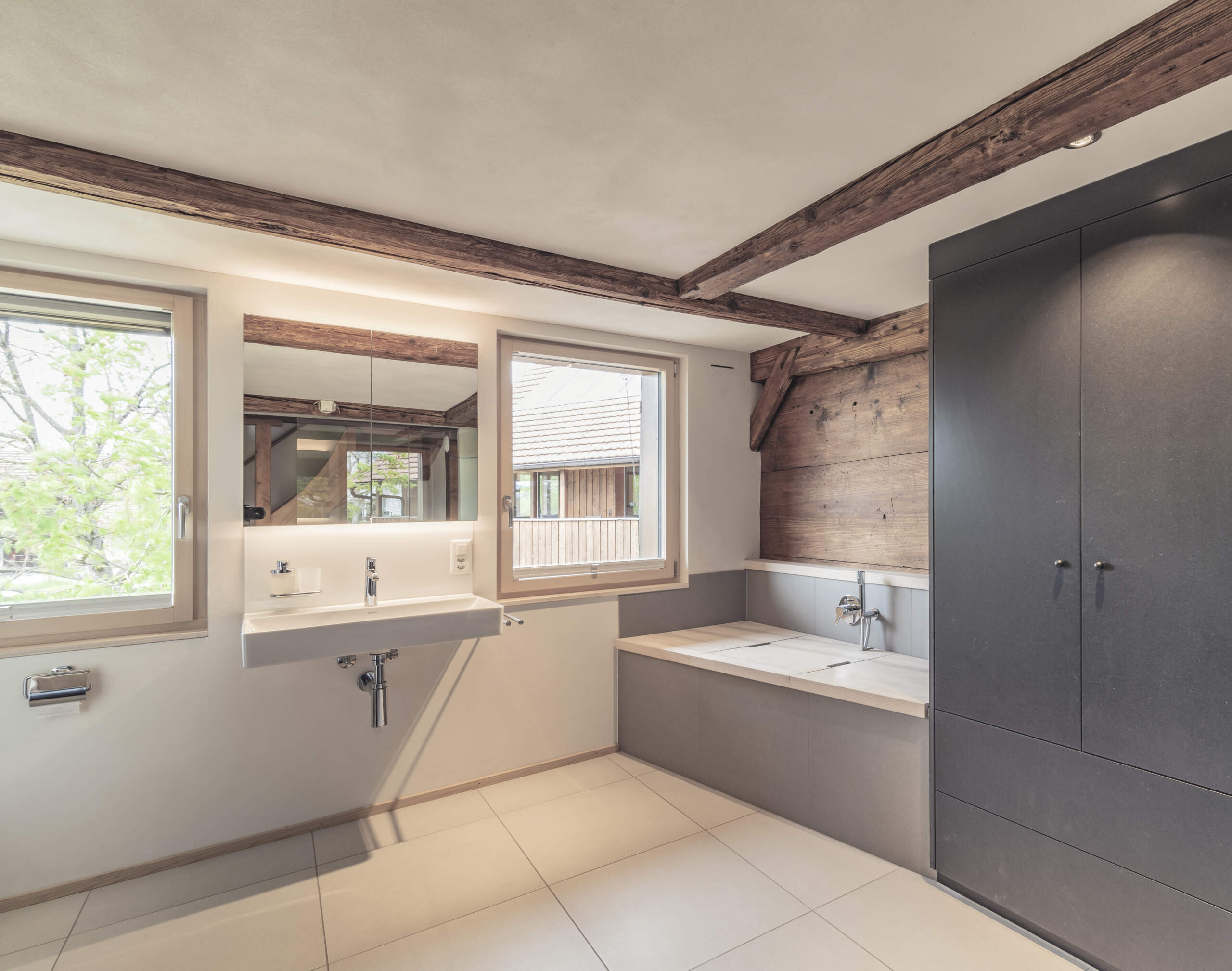 • Badmöbel MDF-Fronten in anthrazit eingefärbt. Innen in massiver Fichte und Buche, natur geölt.