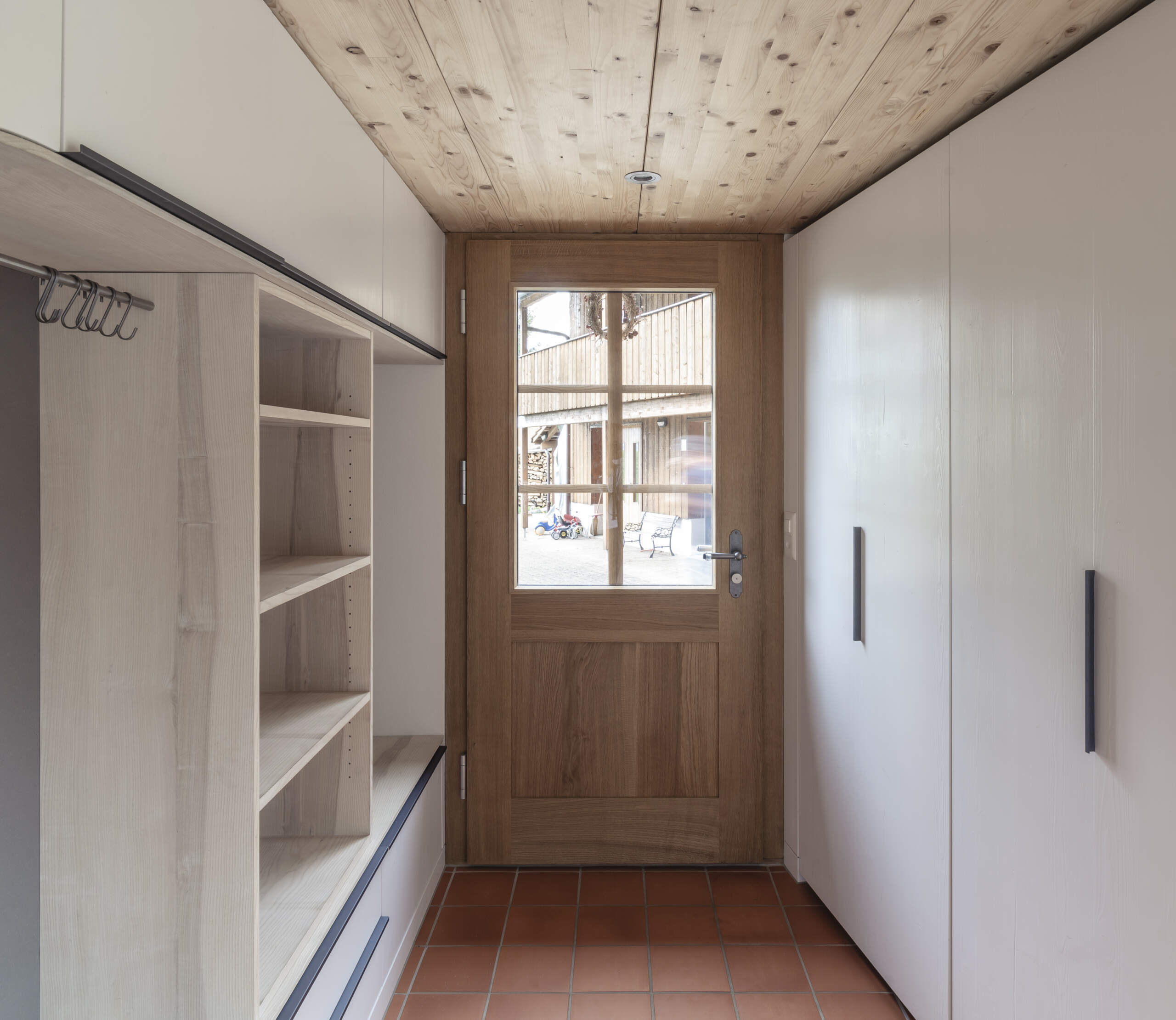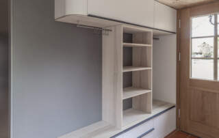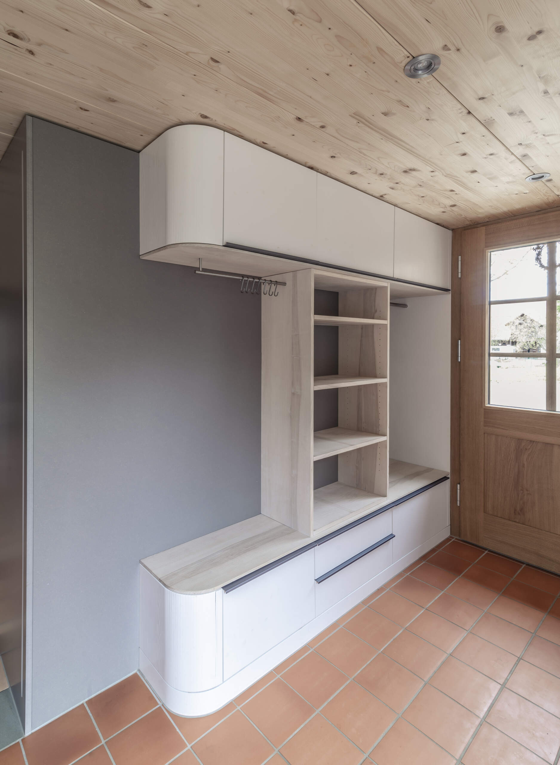 • Garderobe offen in Esche Braunkern massiv, gelaugt und weiss geseift, Fronten in massiver Fichte, leicht gebürstet und lackiert.