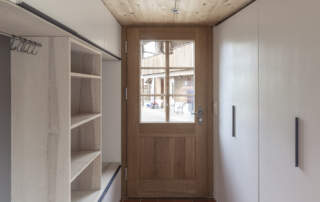 • Haustür gestemmt in massiver Eiche, natur geölt mit aufgesetzten Kreuzsprossen aussen.