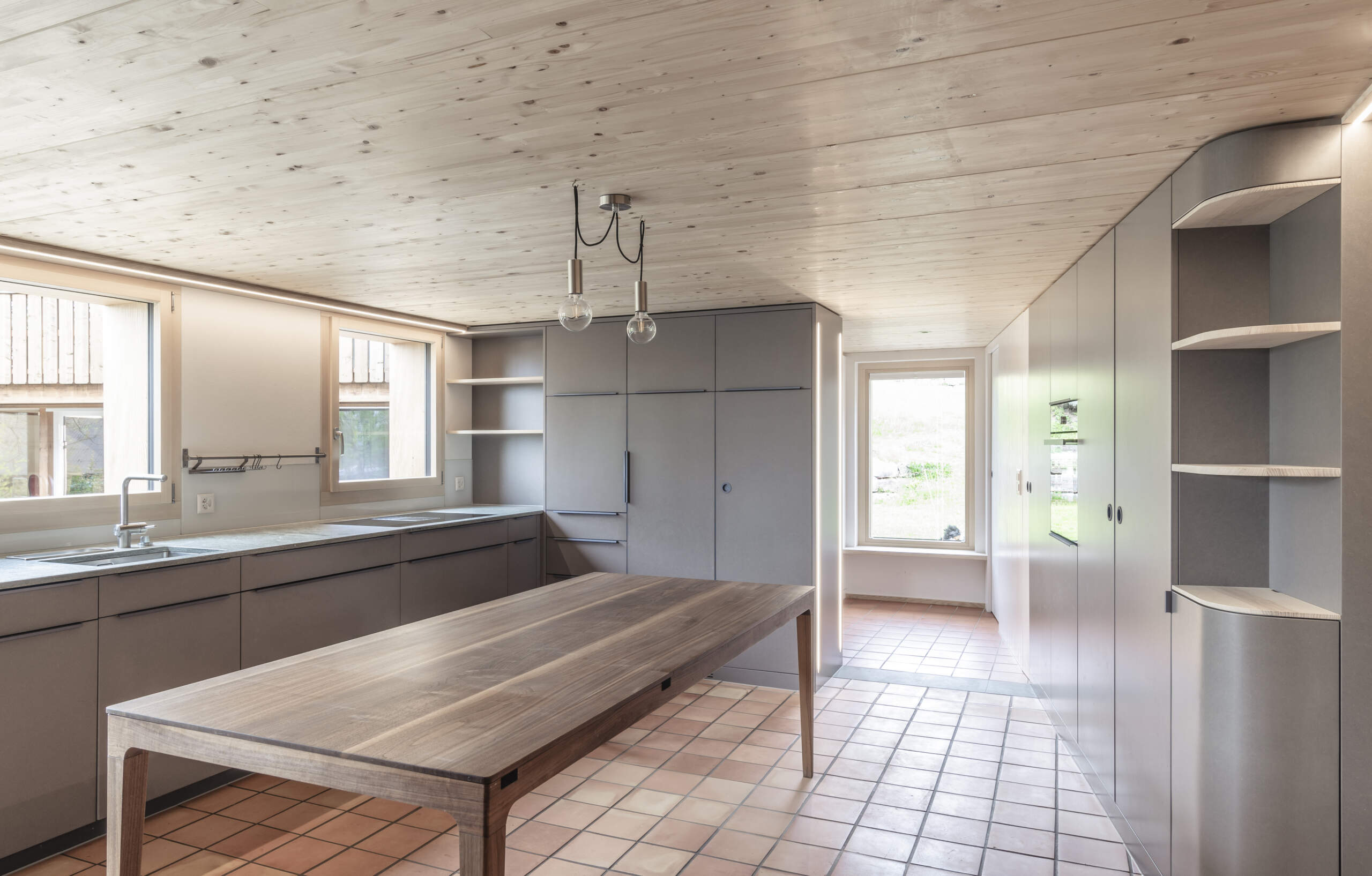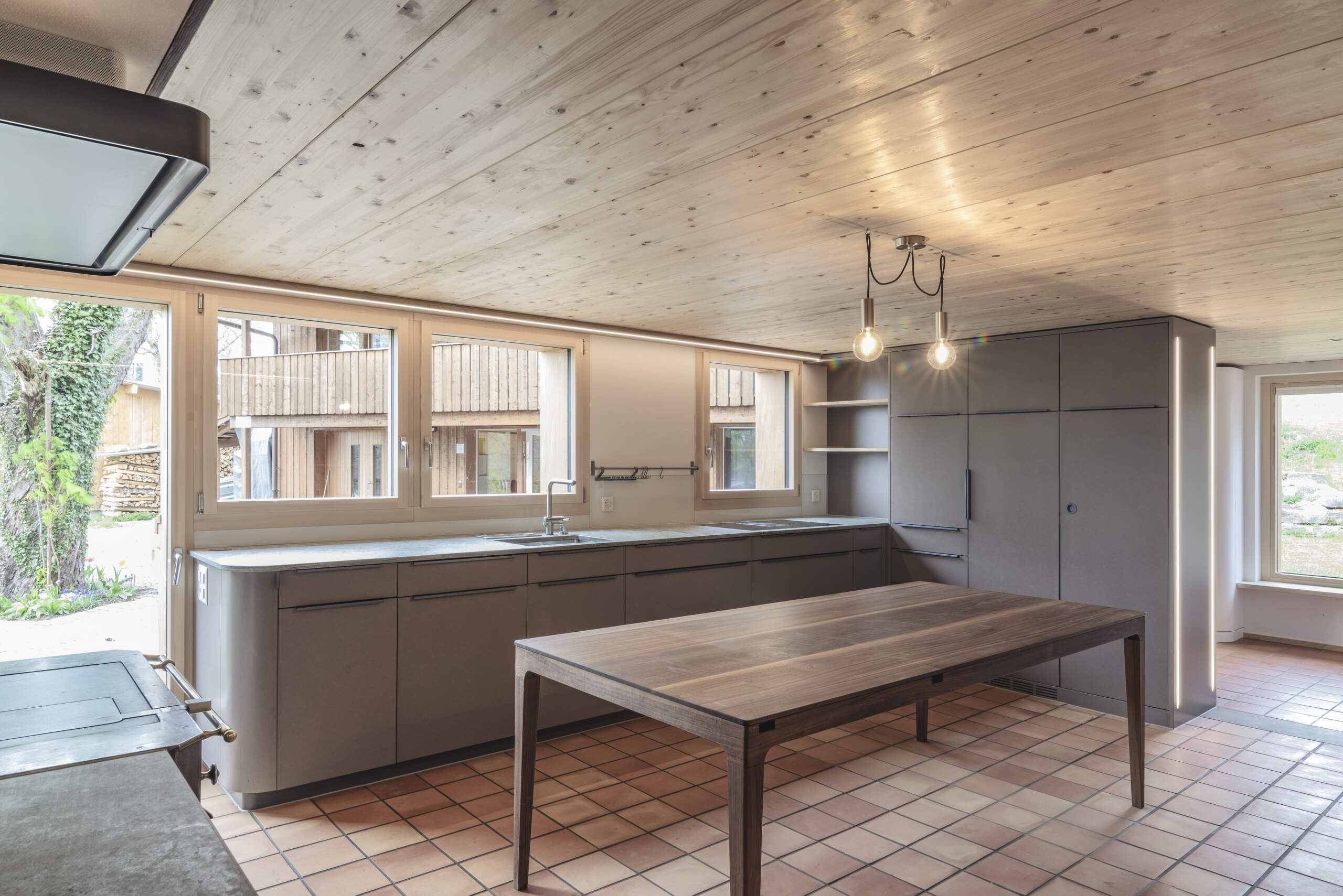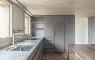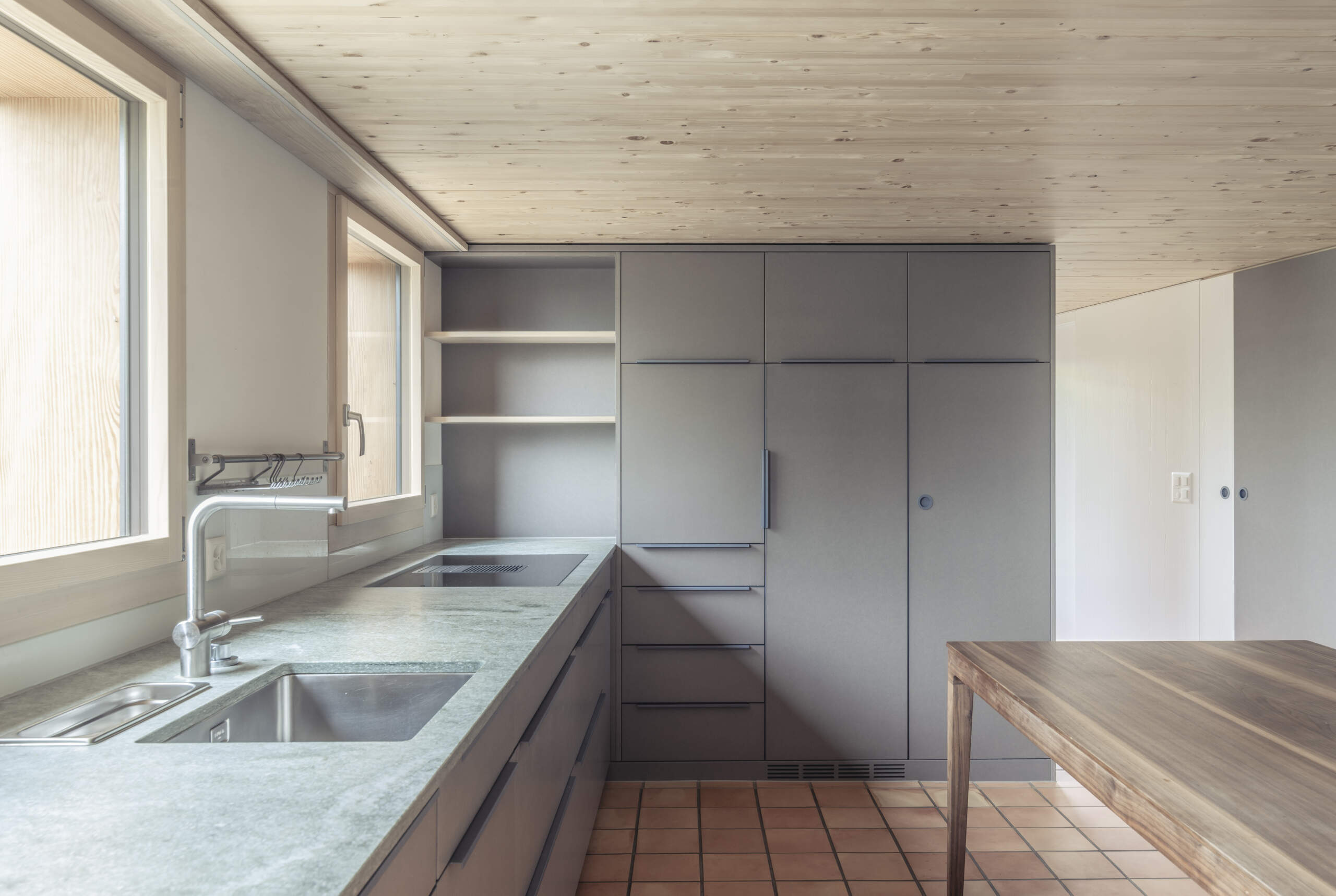 • Massivholzküche MDF eingefärbt in grau und anthrazit (innen Fichte und Buche massiv) mit einer Verde Spluga Quarzit Abdeckung.