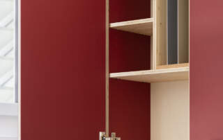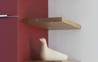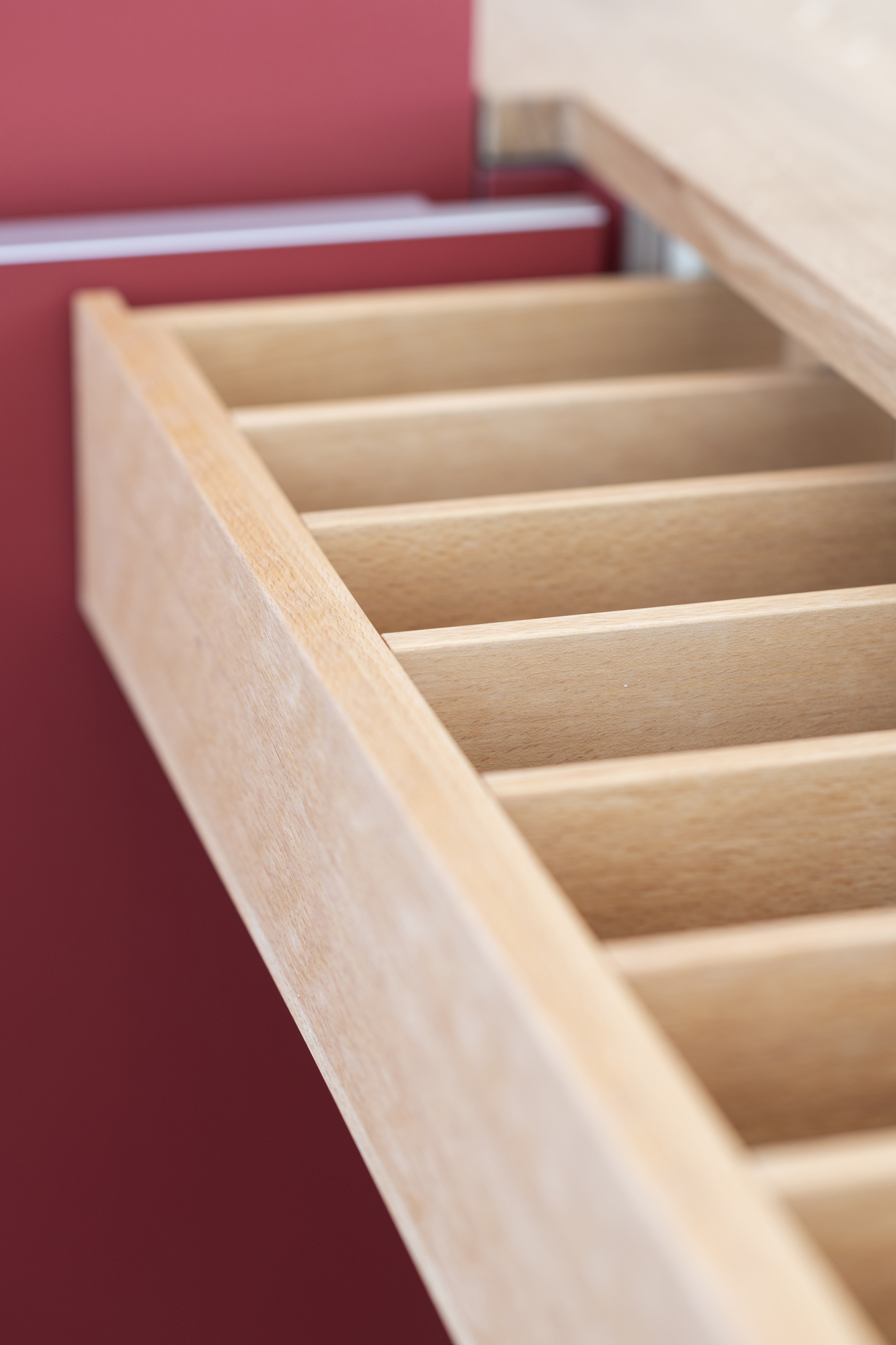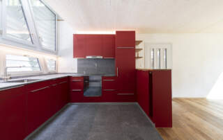 Wenn rot auf Eiche trifft - rote Massivholzküche kombiniert mit Eichenelementen ergänzt mit einem Landhausdielen-Parkett und Treppentritte aus massiver Eiche.