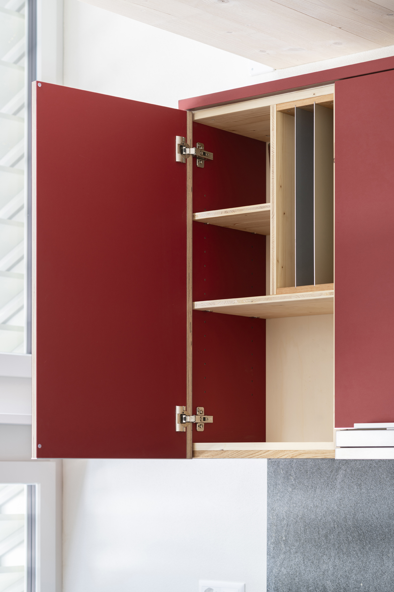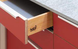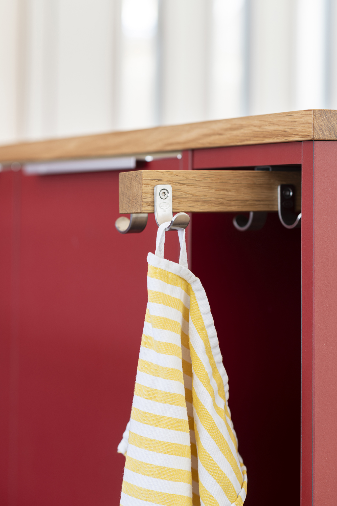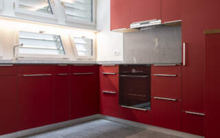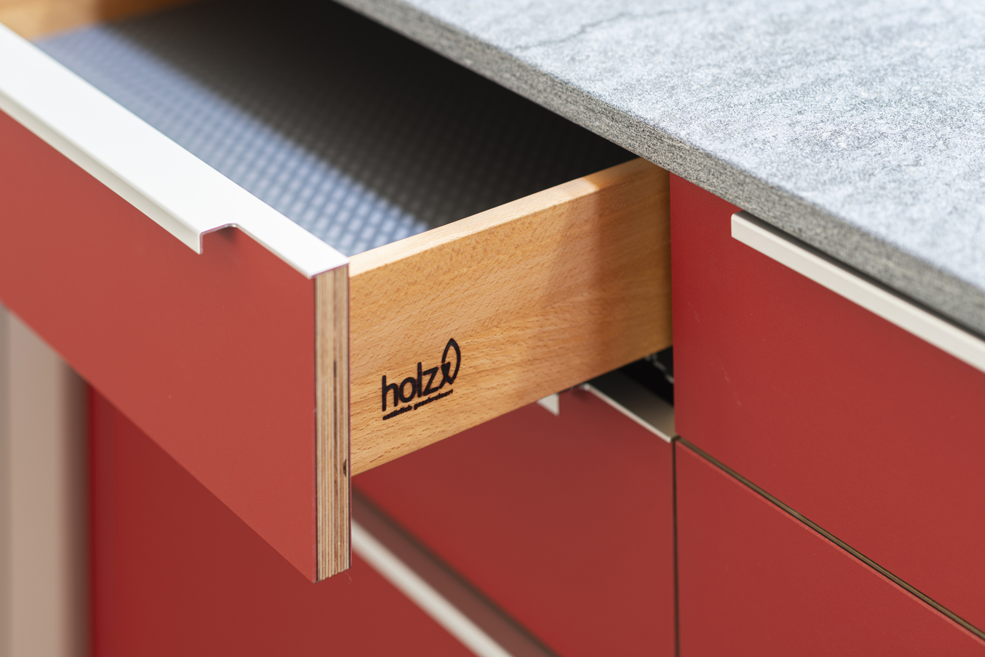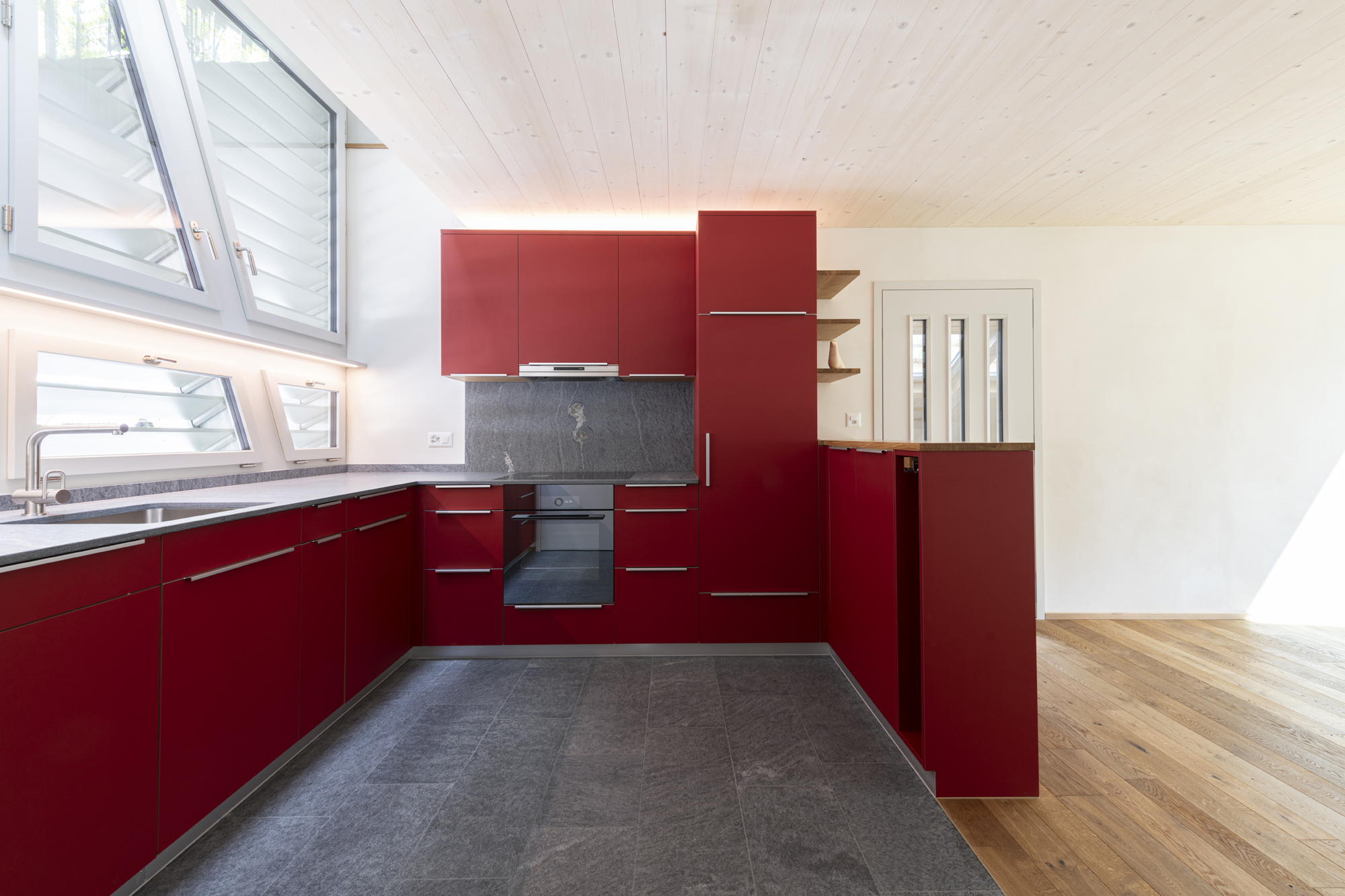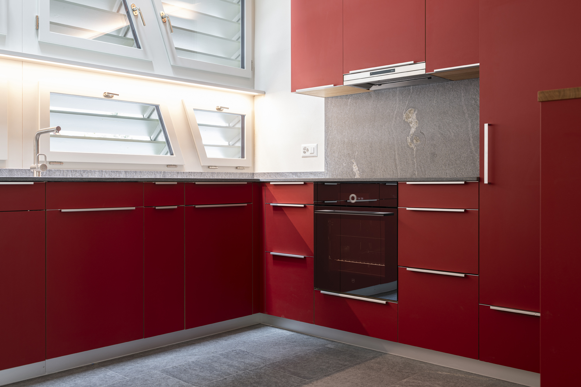 - Massivholzküche mit belegten Lino-Fronten in "Salsa-rot".